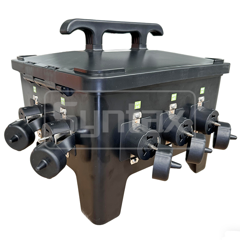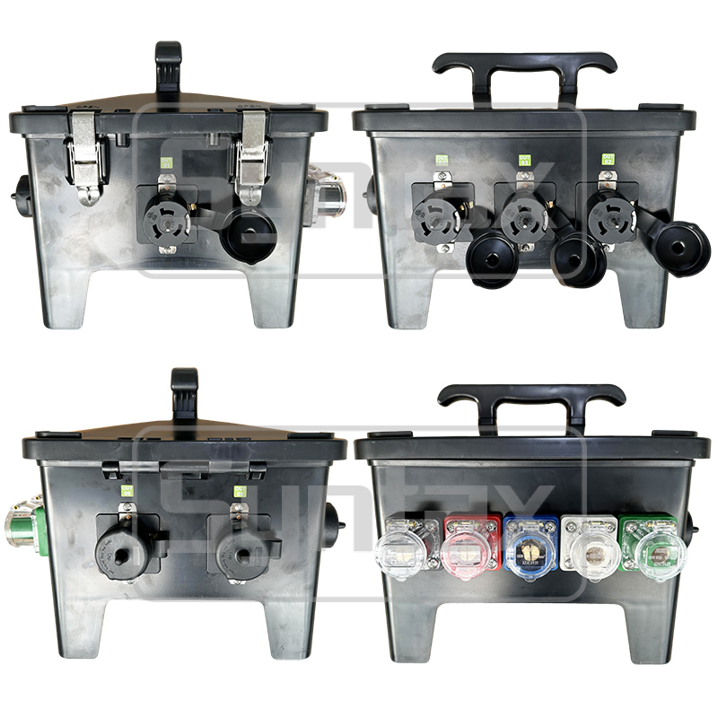 このNEMA標準のポータブルパワーディストリビューションボードは,ライブイベント,スポーツイベント,映画&TVで使用できます. 400A,600VAC,IP67防水です.入口は (5) 400A 600V IP67 キャムロックコネクタ (L1)出口ソケットは (6) 3P 50A125V/250V NEMA SS2-50R 容器sカップ付き6 2P 50A MCB で保護されています. 箱はPCとIP67防水で作られています. これはイベントに特にステージに最適です. オーダーメイドの電源配送箱を作ることができます.