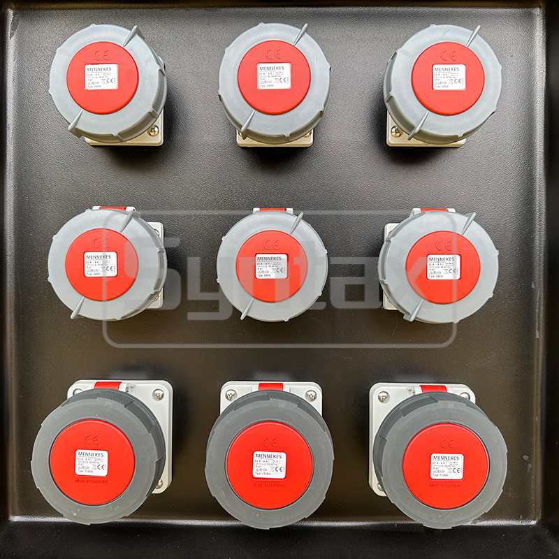 この 3PH 200 アンペアポータブルイベントボックスは、屋外でのステージ一時電源ボックス用に特別にカスタマイズされています。 5 つのカムロックコネクタの入力セットは、4P 200A Schneider MCCB によって保護されています。 出力ソケットは、3 つの 5P 63A 400v IP67 ソケットと、保護なしの 6 つの 5P 32A 400v IP67 ソケットです。 お客様は、Mennekes 製の産業用プラグとソケットのブランドと、Schneider 製のすべてのブレーカーを指定しています。 ボックスは HDPE 製で IP67 防水仕様で、イベント、特にステージに最適です。 ご注文に応じてカスタムメイドの配電盤を製作できます。
