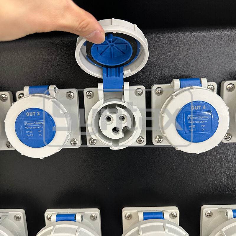 | 出力 1-6 | 6 × 3P 16A 220V IP67 パネルマウントソケット、6 × 1P+N 16A 30mA RCBO で保護 |