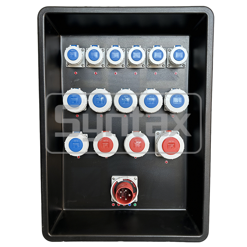| 出荷する 13-14 | 2×5P 32A 400V IP67 パネルマウントソケット,2×4P 32A MCBs + 2×Earth Leakage Relayによって保護され,タグリングスイッチ |