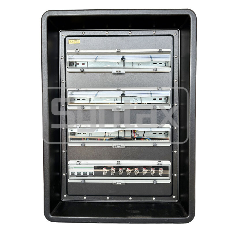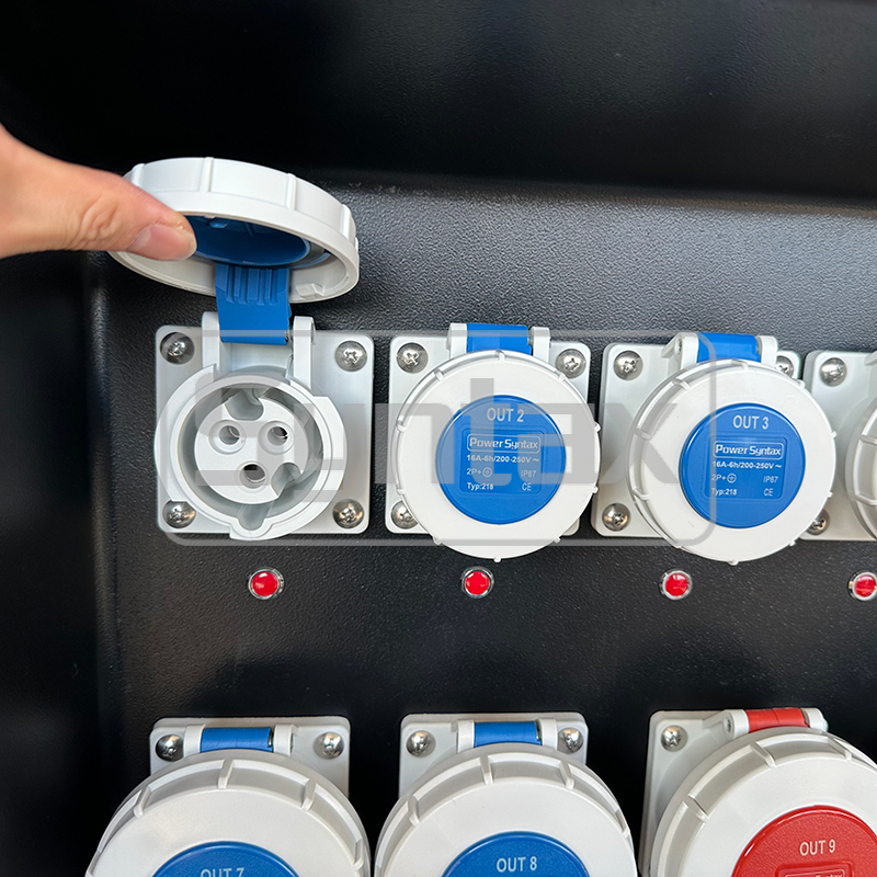| 出発する1〜6 | 6 × 3P 16A 220V IP67 パネルマウントソケット, 6 × 1P+N 16A 30mA RCBO で保護 |